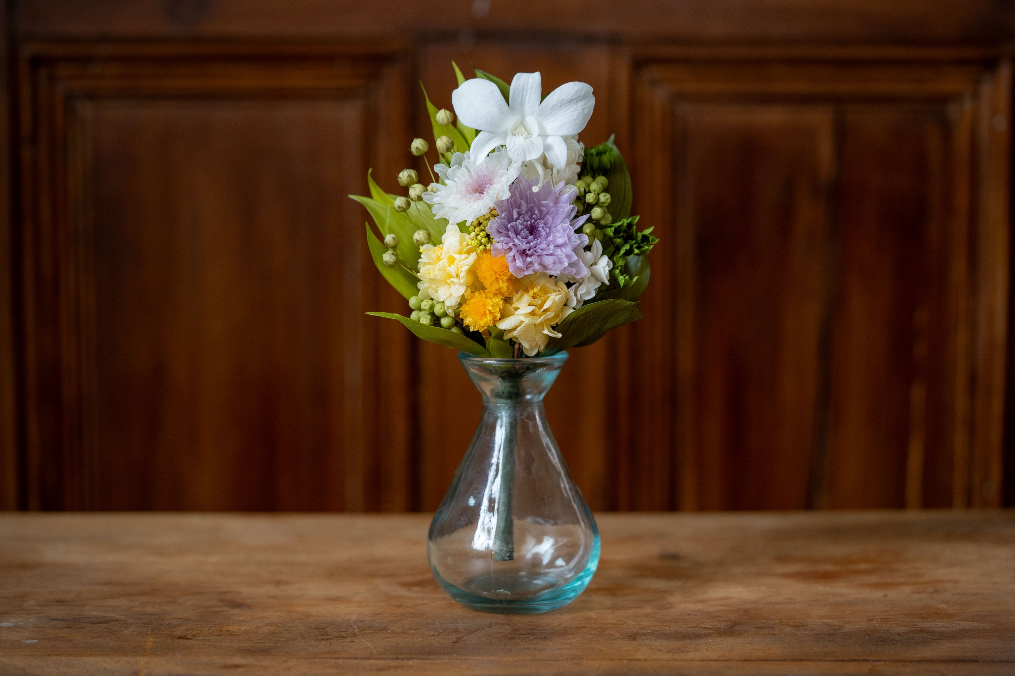 小菊2種、千日紅、デンファレ、あじさい、リーフ他(プリザーブドフラワー)