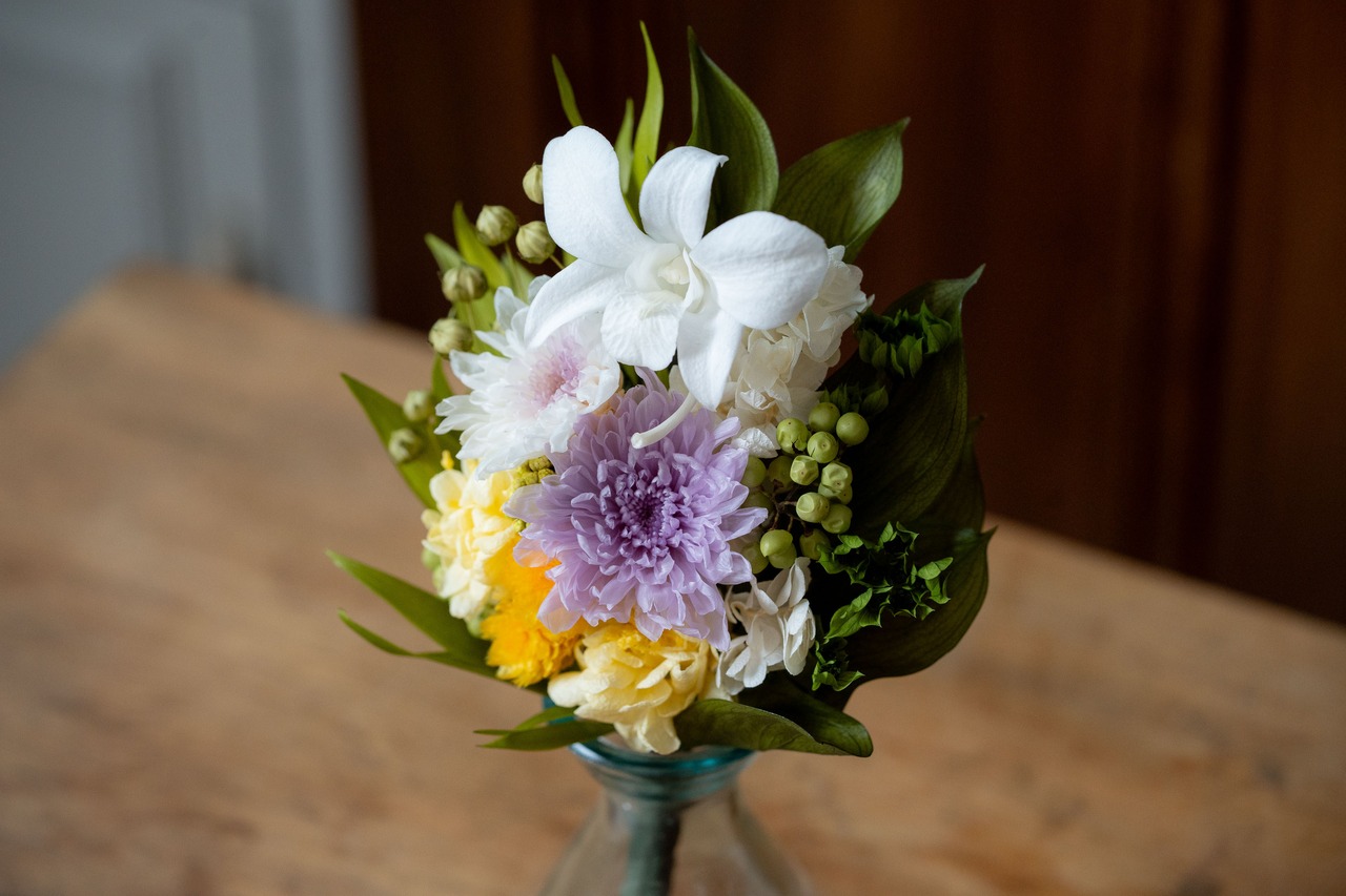 淡いライラックと中心がほんのり色づいた2種類の小菊、まあるい花穂が愛らしい千日紅に、まるで蝶が羽を広げているような花姿の白いデンファレをアクセントに添えて、こぶりなサイズのお仏花を作りました。