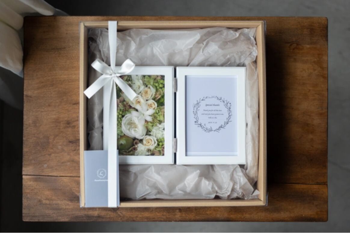 また、カードのかわりにお手持ちのお写真を当方へお送りいただき、フレームに収めた状態でのラッピングも承っております。