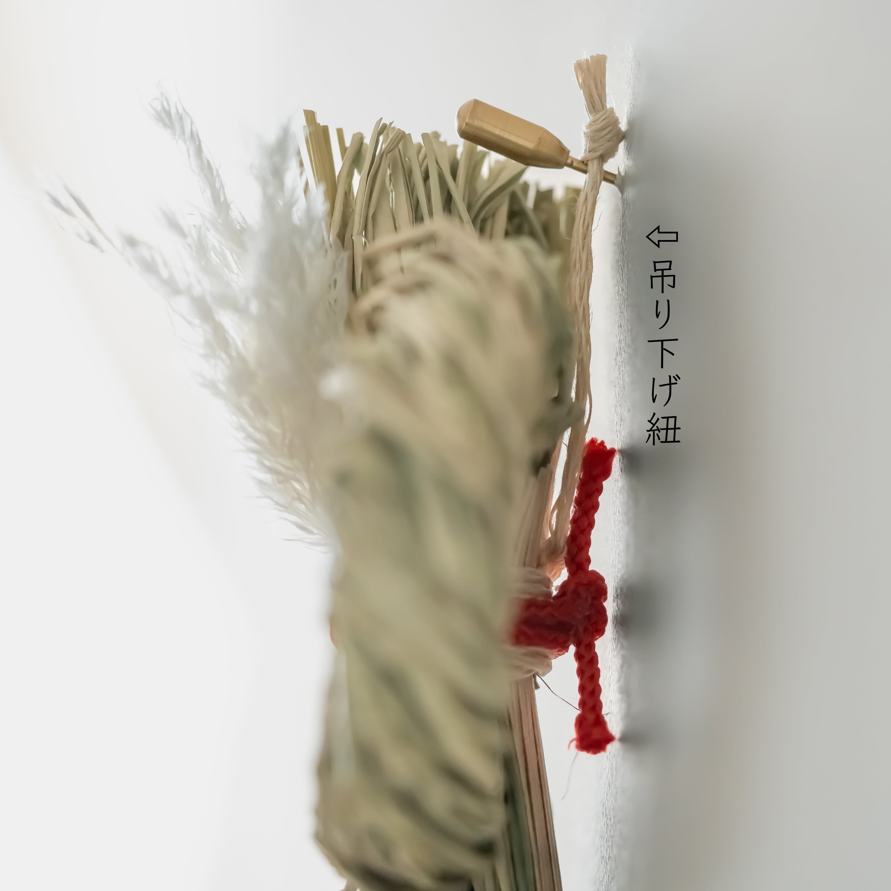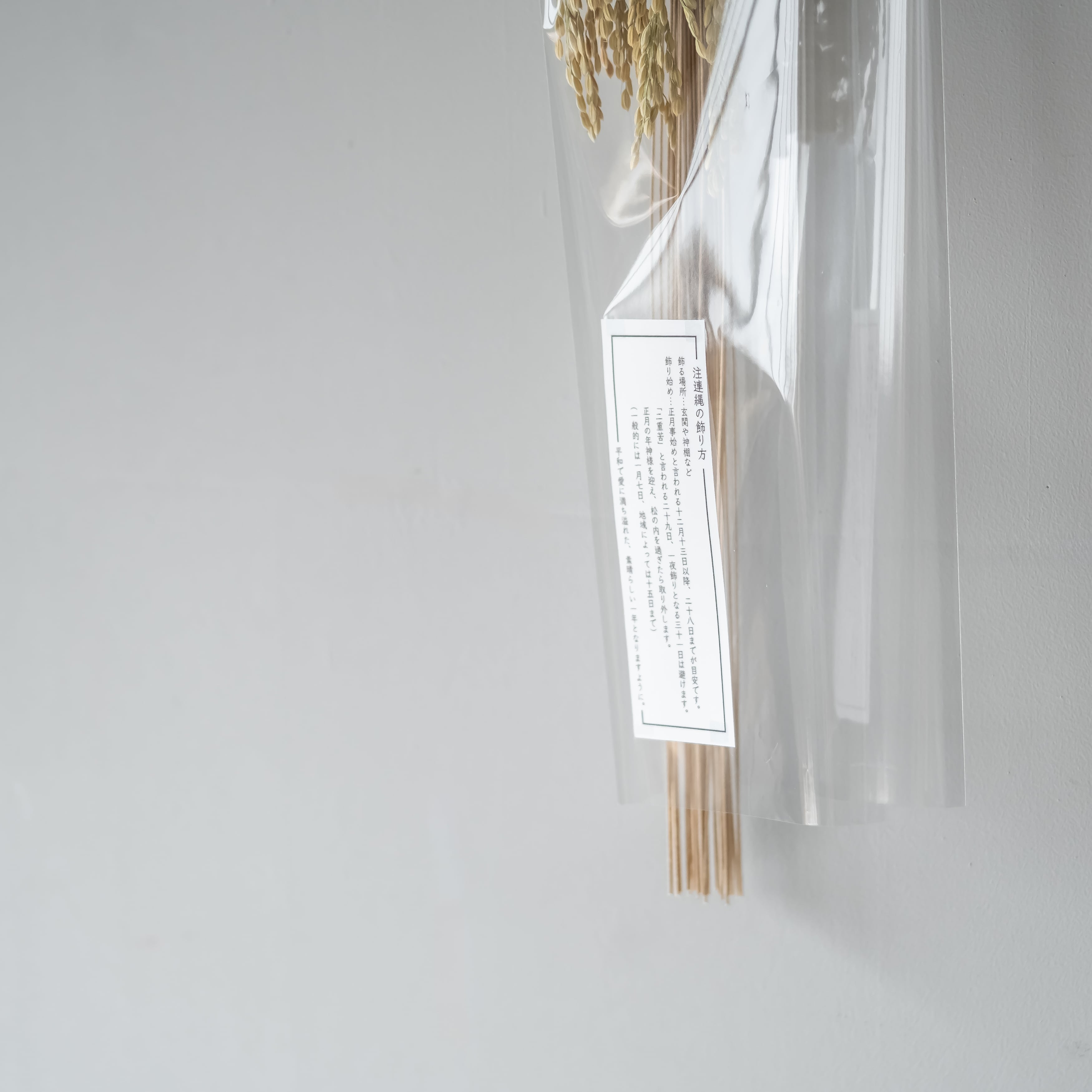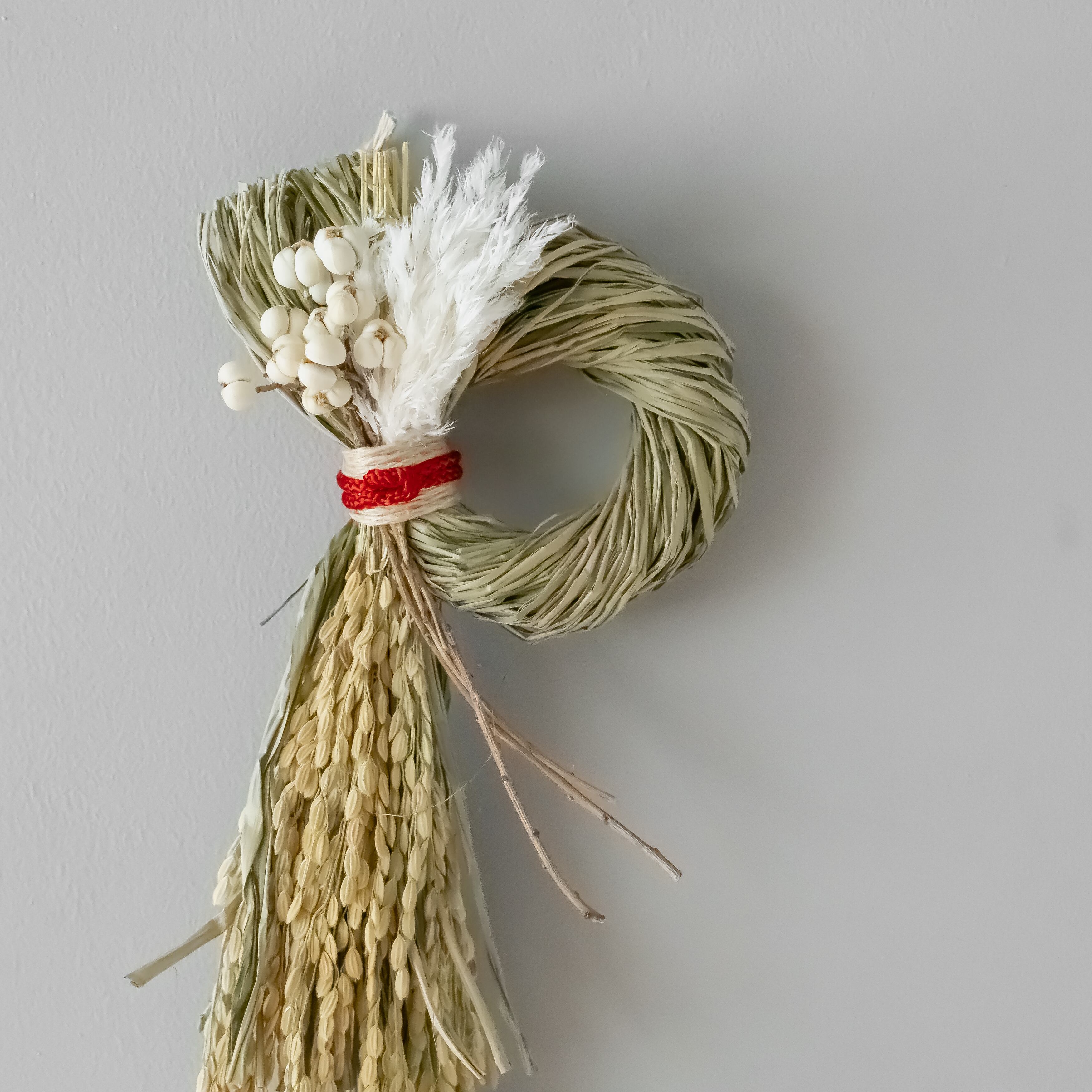 水引をあしらったラフィアのリースに、ぷっくり白い実のナンキンハゼと、たわわに実った稲穂を添えた、シンプルながらも風情のあるしめ縄です。