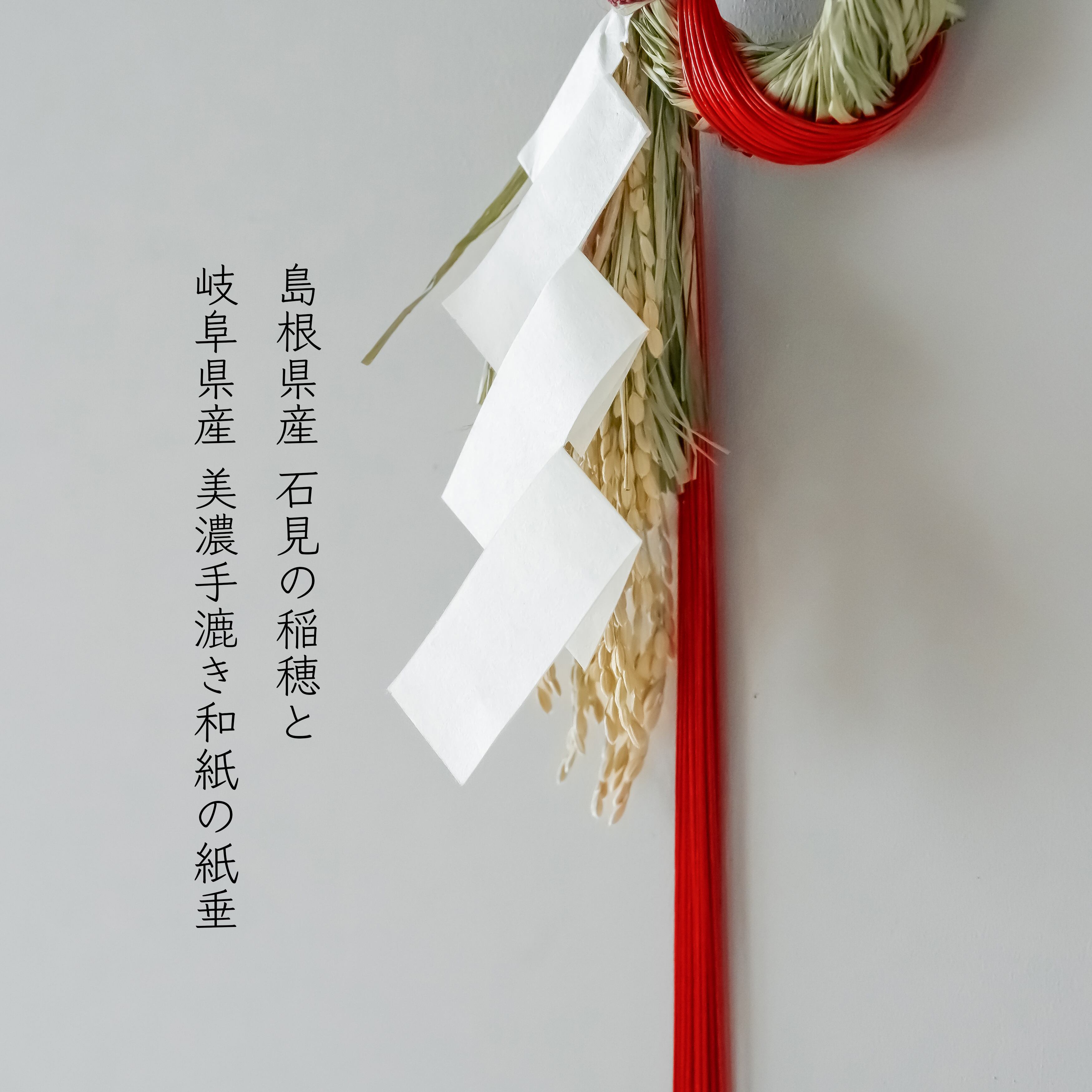 水引をあしらったラフィアのリースに、ぷっくり白い実のナンキンハゼと、たわわに実った稲穂を添えた、シンプルながらも風情のあるしめ縄です。