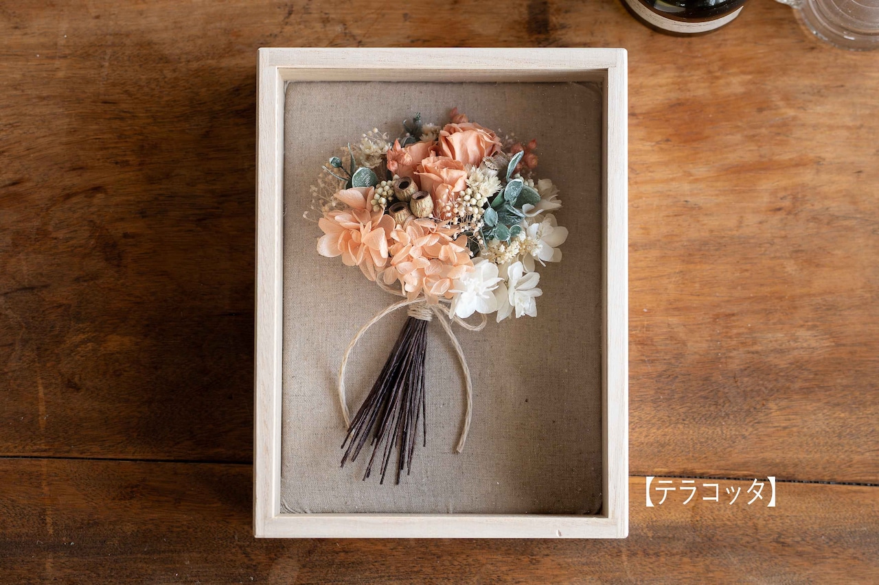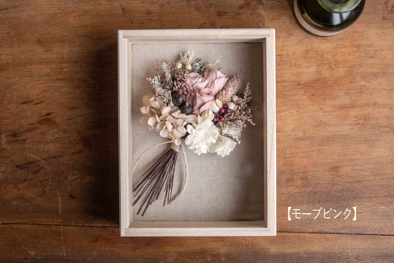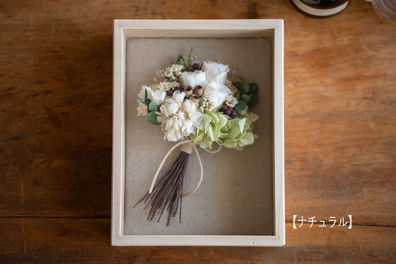 プリザーブドフラワーとドライフラワーを使用したミニブーケボックスです。